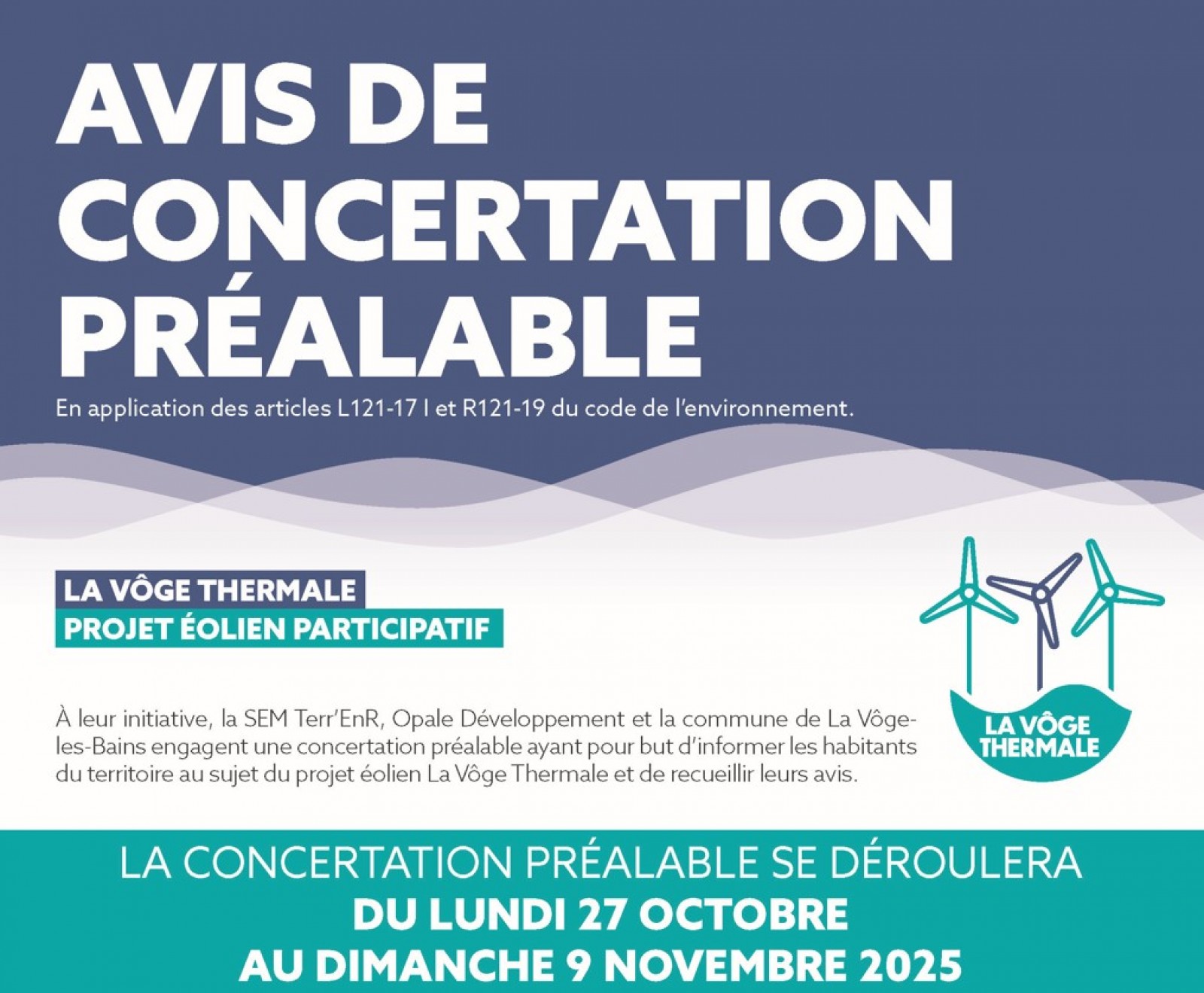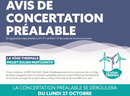 A leur initiative, la SEM Terr’EnR, Opale Développement et la commune de La Vôge-les-Bains organisent une concertation préalable. Elle permettra d’informer les habitants du territoire au sujet du projet éolien et de recueillir leur avis.