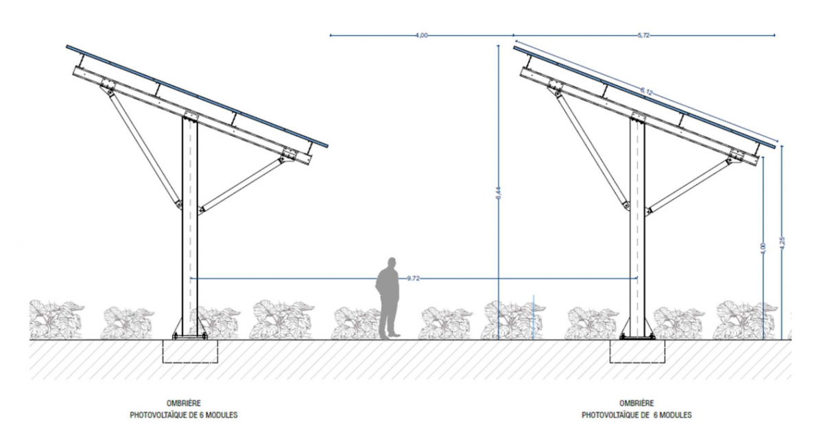 Les structures prévues mesureront 4 mètres au point bas et 6,44 mètres au point haut, des dimensions compatibles avec le passage des engins agricoles. Le choix de modules fixes, orientés sud-ouest, a été retenu pour sa simplicité, sa robustesse, et sa capacité à offrir une ombre stable.